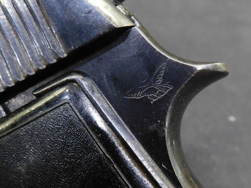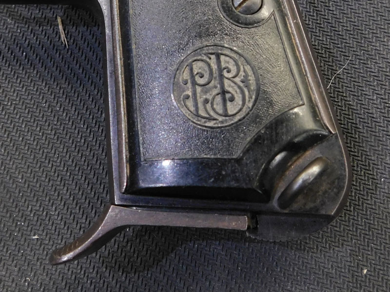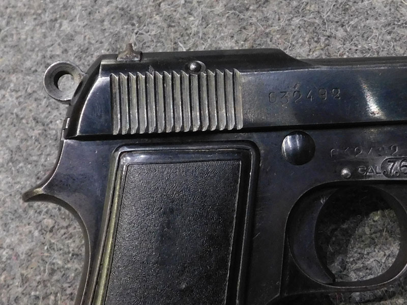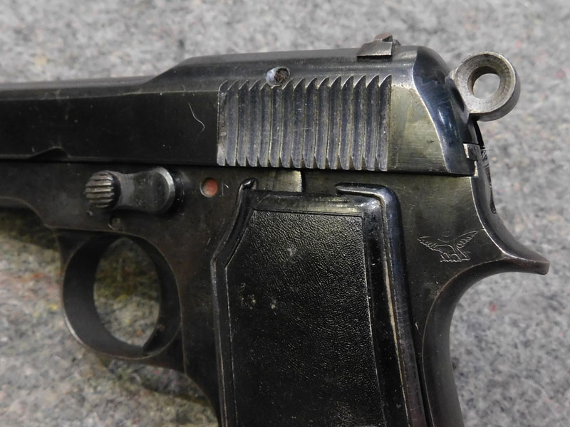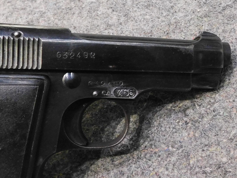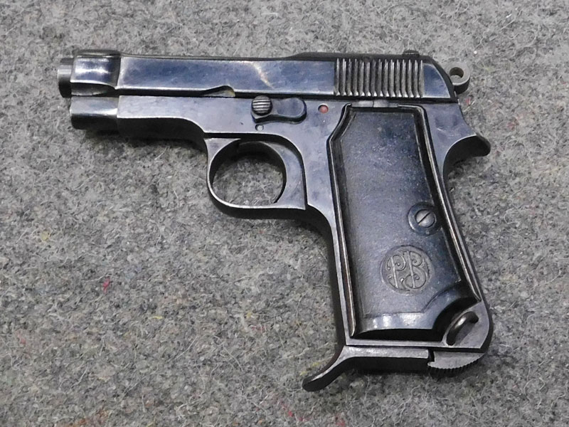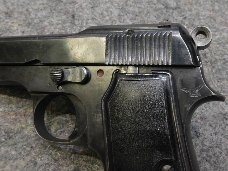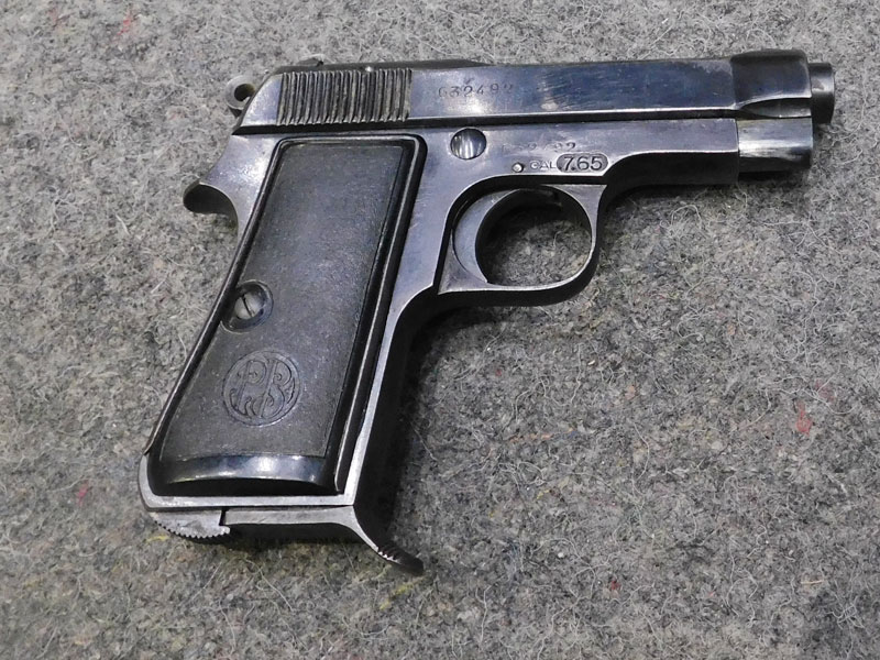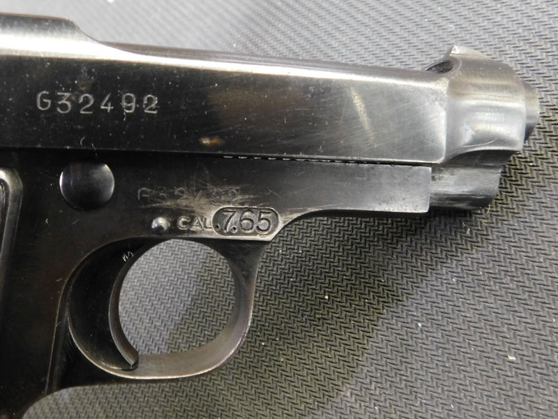 Pistola Beretta modello 34 – contratto Regia Aeronautica – anno 1943 – serie “G” senza scritte con la sola indicazione del calibro (vedi Menchini/Taviani) – guancette in Fibak – anello per correggiolo – trasformata in calibro 7.65 con la sostituzione della canna – calibro ripunzonato – classificata arma comune – buone condizioni generali – canna molto buona