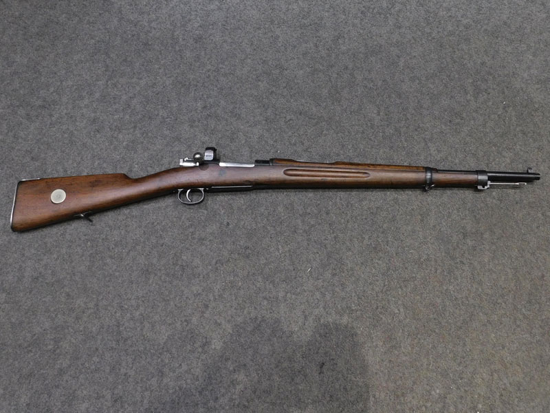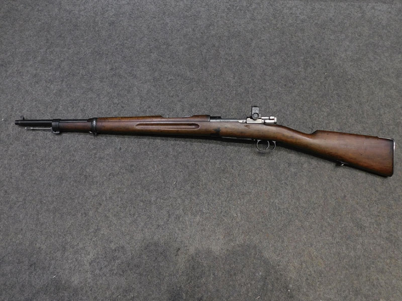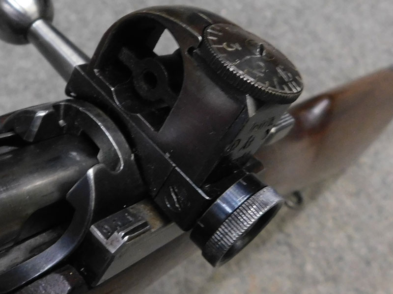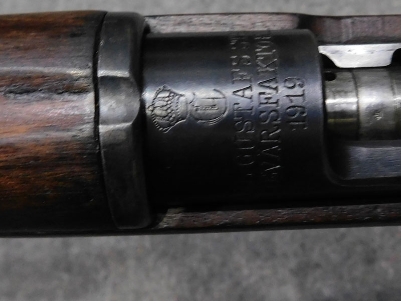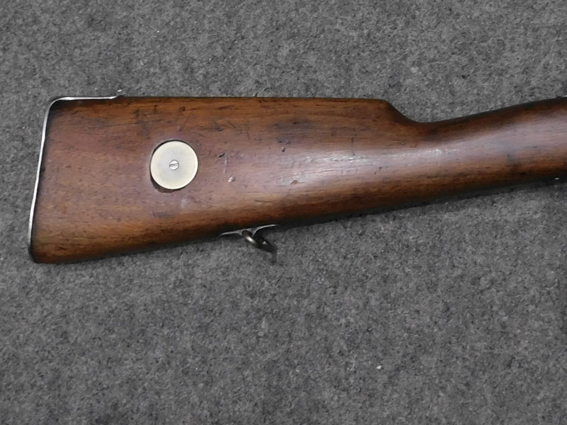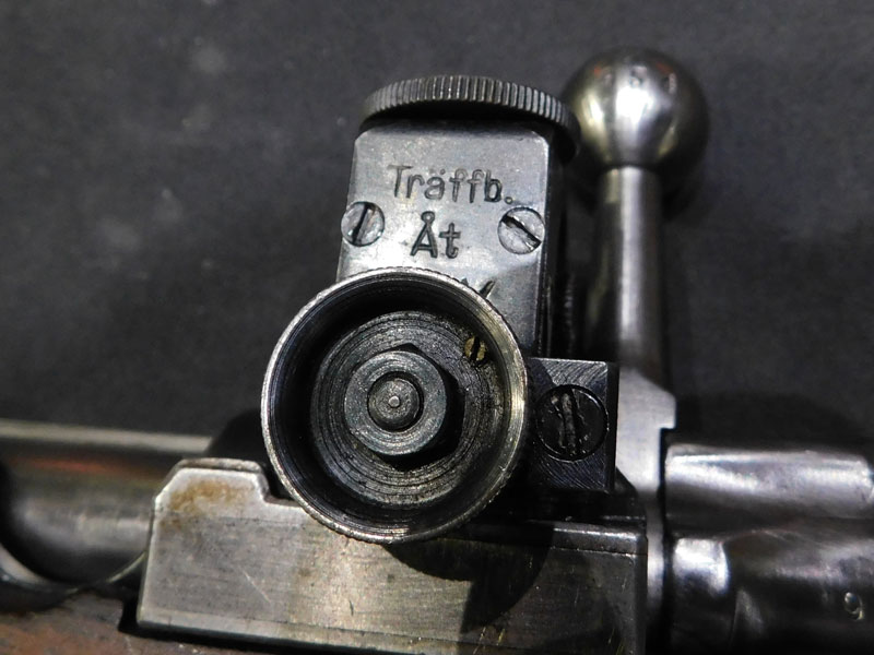 Carabina Carl Gustafs modello 96/38 – calibro 6.5 x 55 – derivato da fucile Carl Gustafs M96 del 1919 – canna filettata con bussola coprifiletto – otturatore e fondello in metallo monomatricola, bacchetta di pulizia no – parti minori con punzone di controllo e accettazione ma senza matricola – mirino alto + 0.5 – diottra Soderin – classificata arma da caccia – condizioni generali molto buone – canna ben spigolata