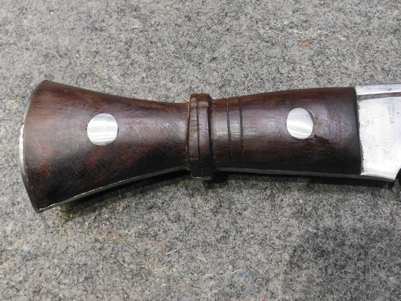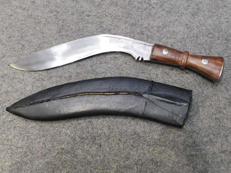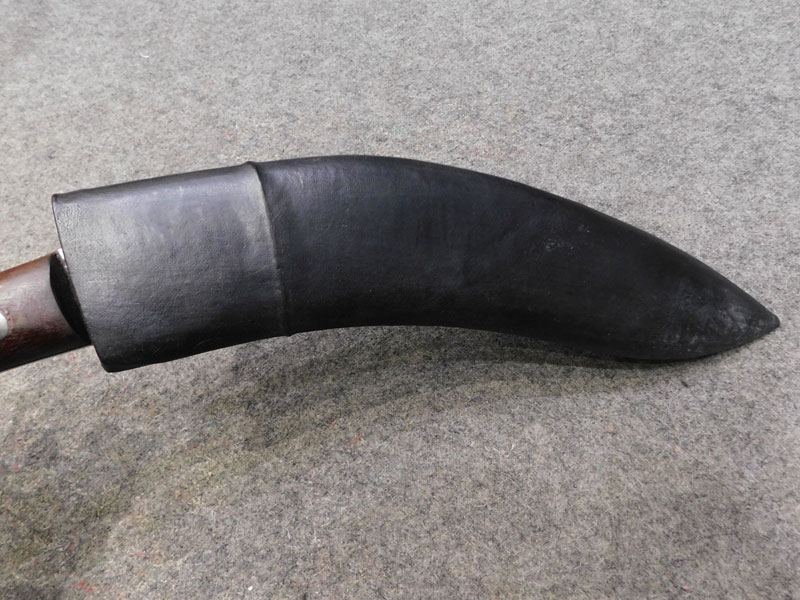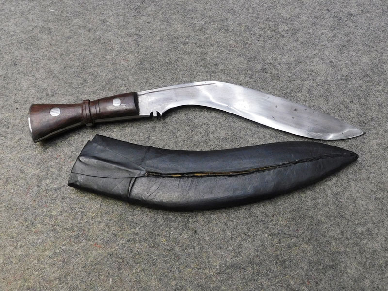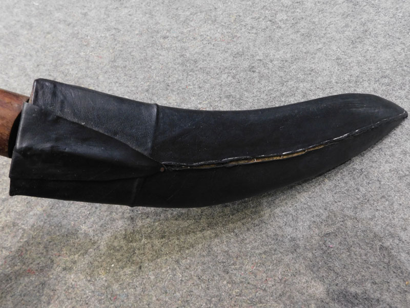 Coltello nepalese Kukri (Baspate Kukri) – impugnatura in legno – fodero in legno rivestito in pelle – punzoni non identificati – tipologia utilizzata dai mitici Gurka – ottime condizioni, puntinature di ruggine – senza filo – LIBERA VENDITA