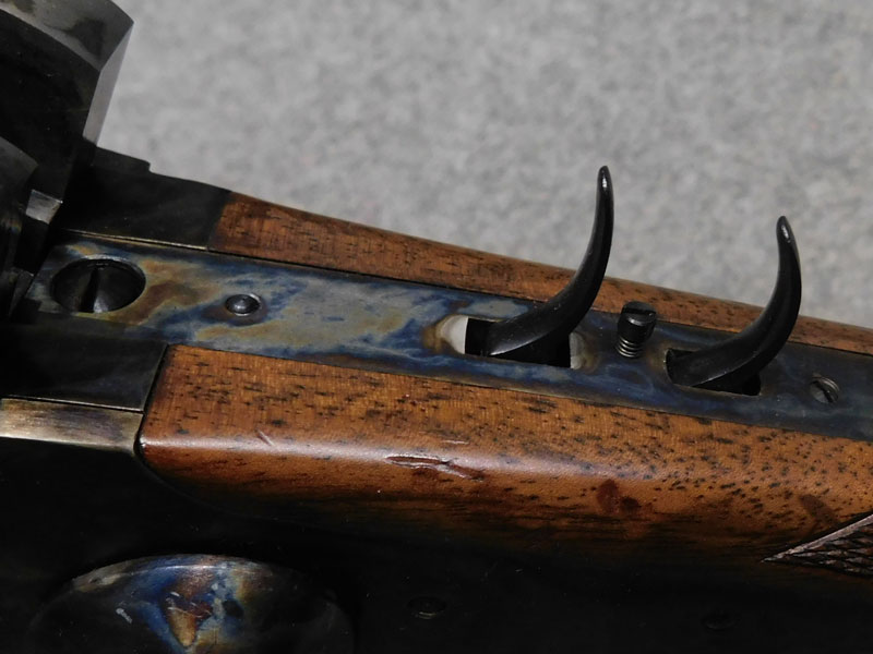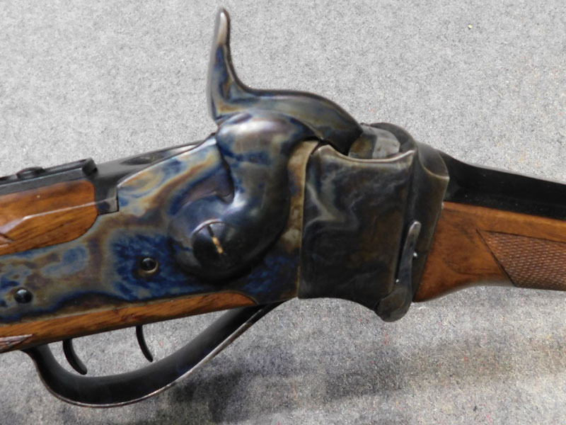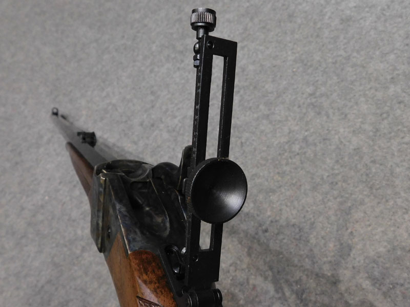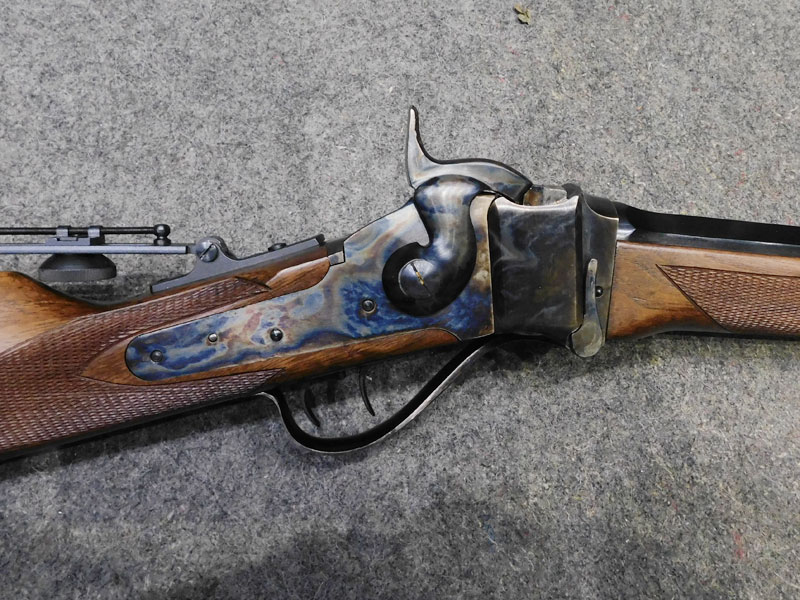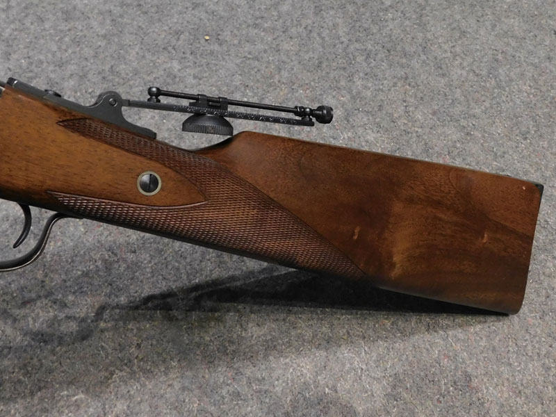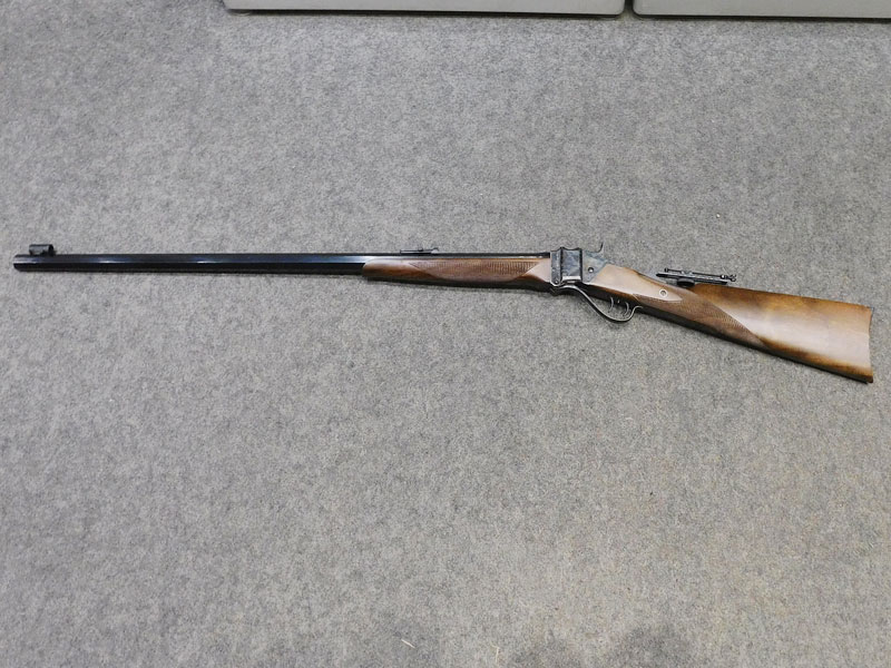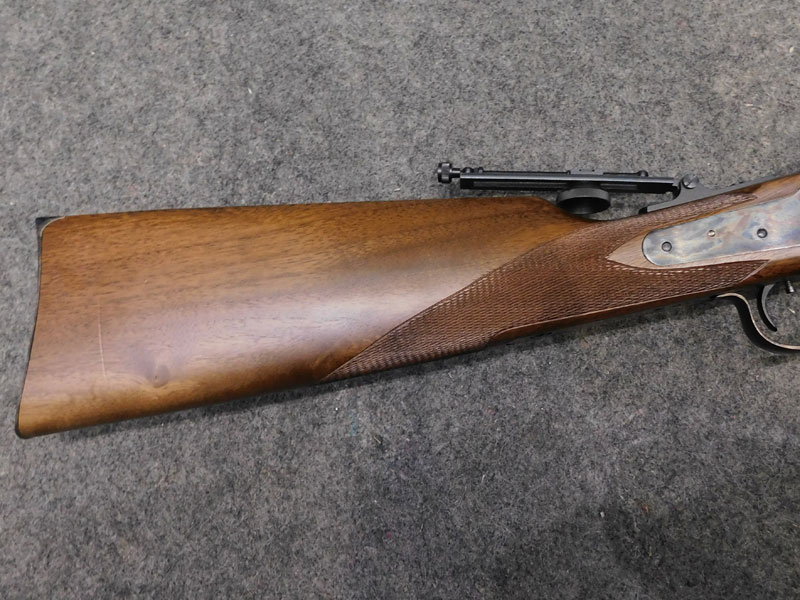 Carabina monocolpo Pedersoli modello Sharp 1874 Sporting – calibro 45/70 GVT – canna ottagonale da 32 pollici (810 mm.) – stecker a doppio grilletto regolabile – calciatura con zigrino – culatta con finitura tartarugata – alzo regolabile – diottra ribaltabile e tunnel coprimirino originali Pedersoli – classificata arma da caccia – condizioni ottime/eccellenti