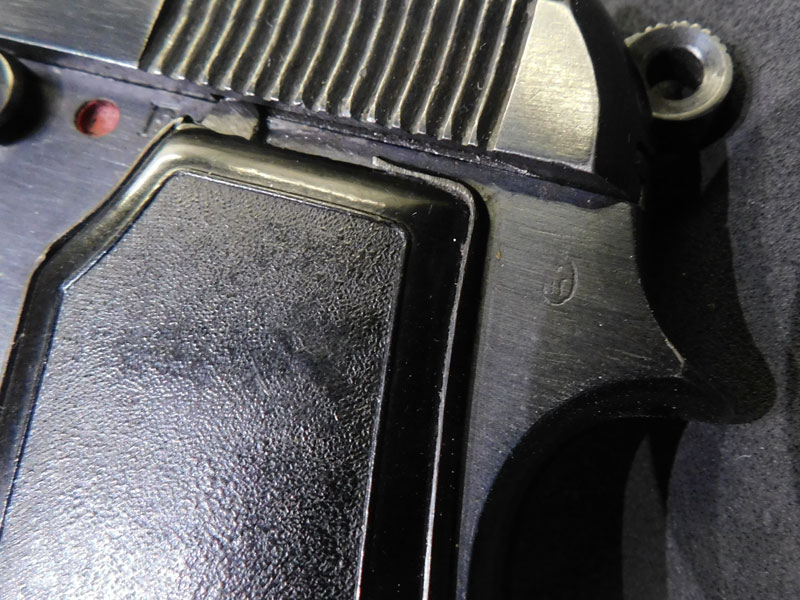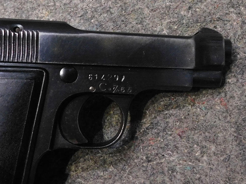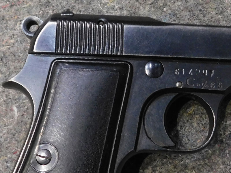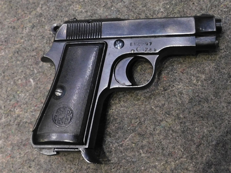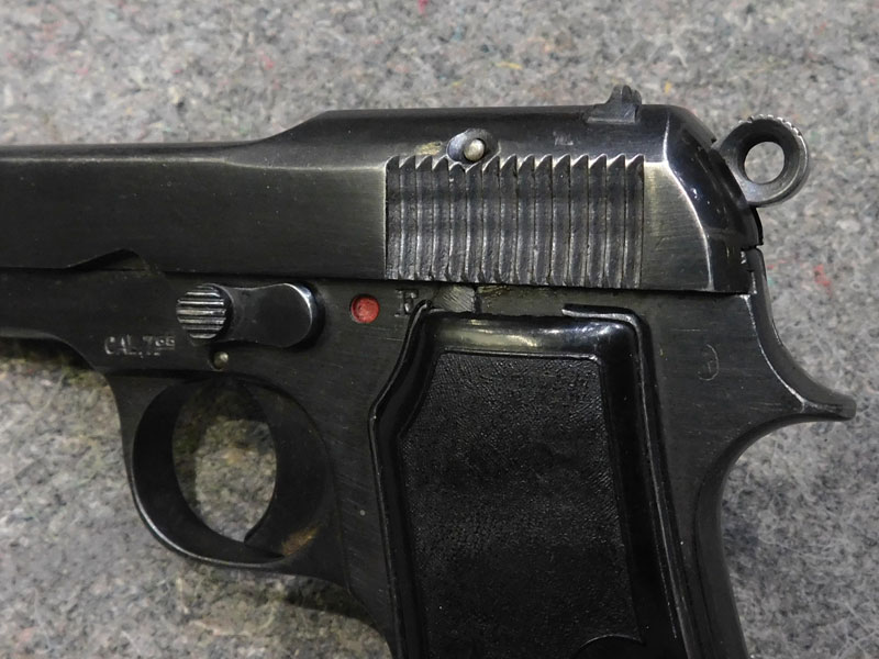 Pistola Beretta modello 1935 – calibro 7.65 – rework post bellico senza scritte sul carrello – lotto matricolare ex RSI Repubblica Sociale italiana con punzone 4UT (Quarto Ufficio Tecnico) parzialmente leggibile – guancette in Fibak – anello per correggiolo – canna FNA non matricolata – doppia indicazione del calibro (una ribattuta) – caricatore marcato Beretta – condizioni generali molto buone – canna non perfetta