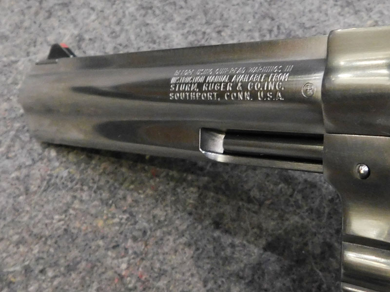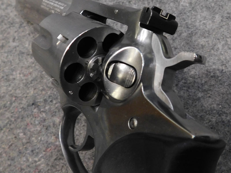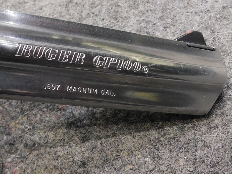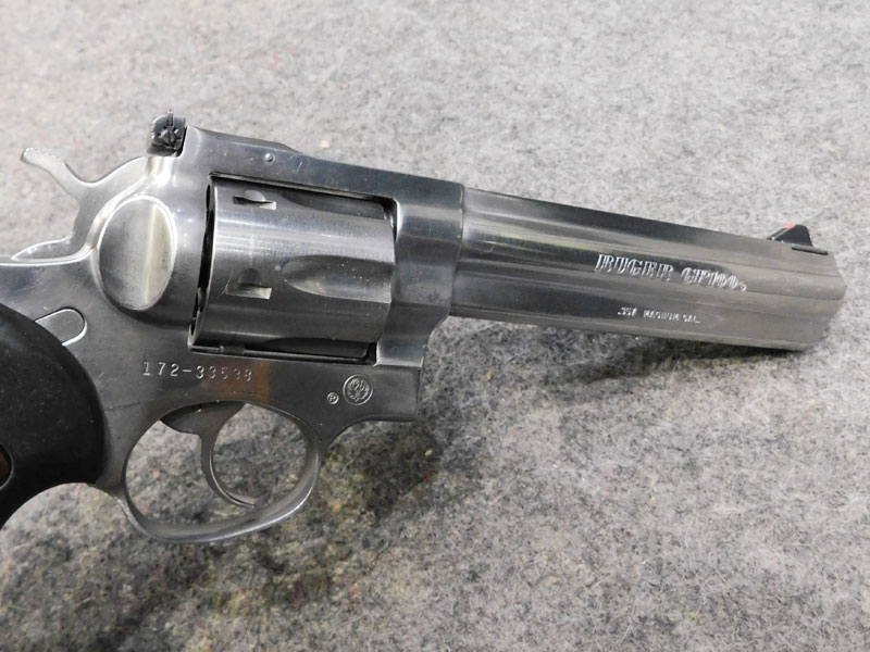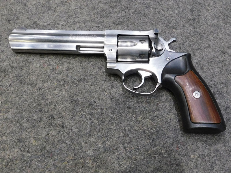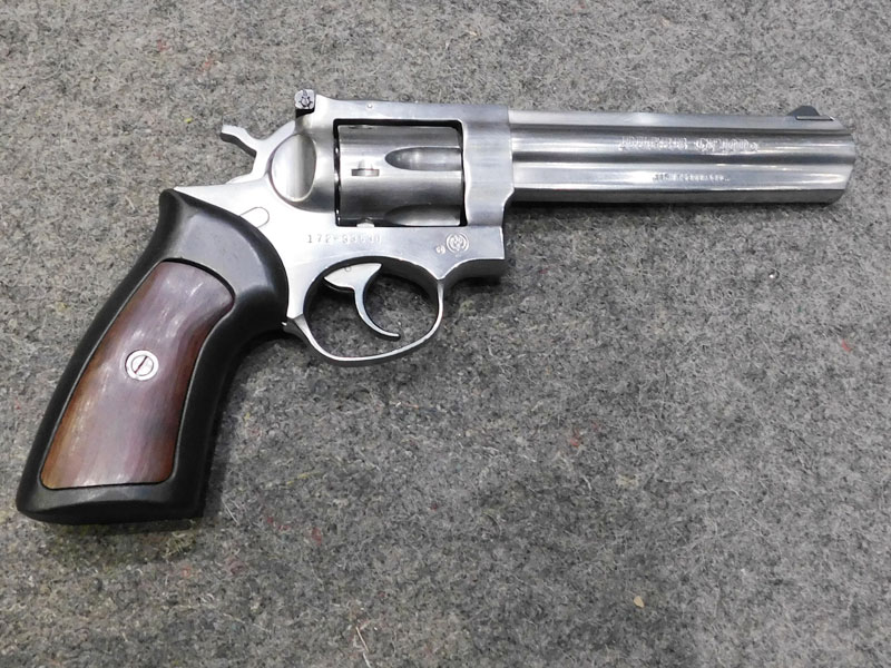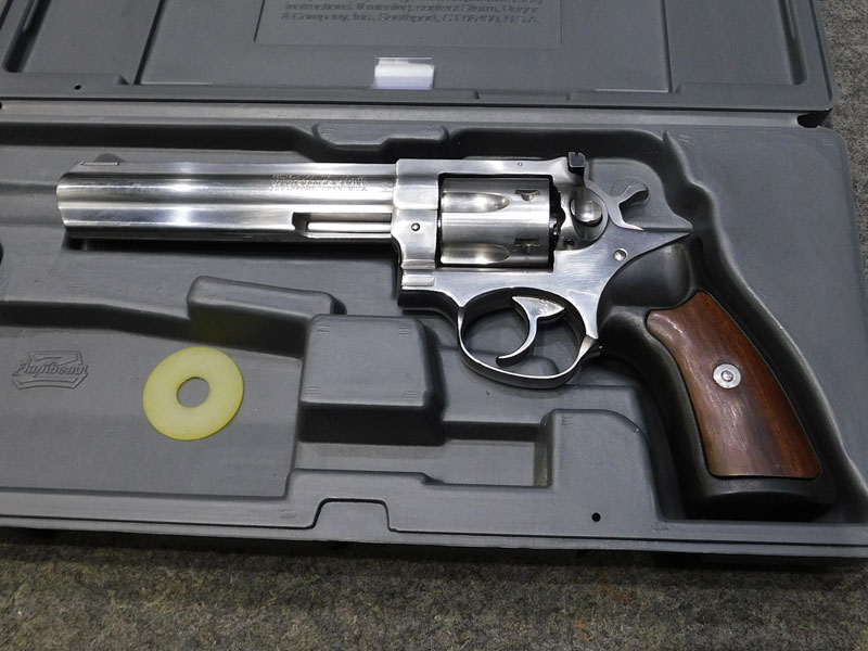 Revolver sportivo usato Ruger modello GP 100 Inox – tamburo 6 colpi calibro 357 magnum – canna pesante full lug da 6” – tacca di mira regolabile – guancette in gomma con inserti in legno – valigetta originale – anno 1991 – classificata arma sportiva – ottime condizioni, leggeri segni d’uso