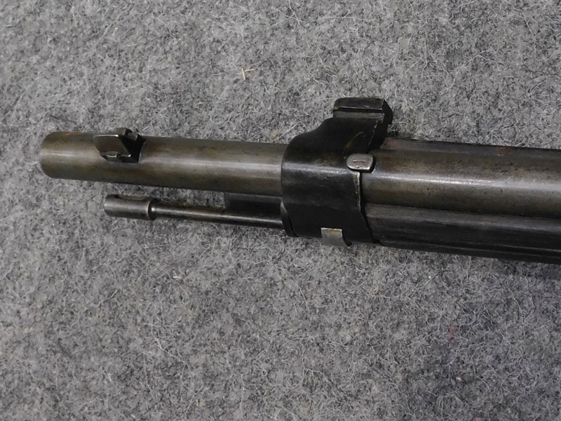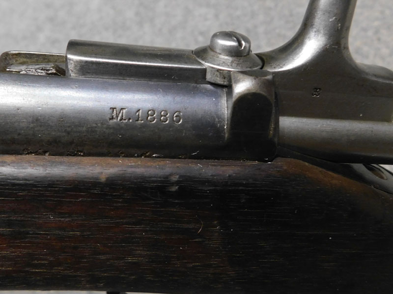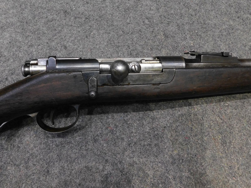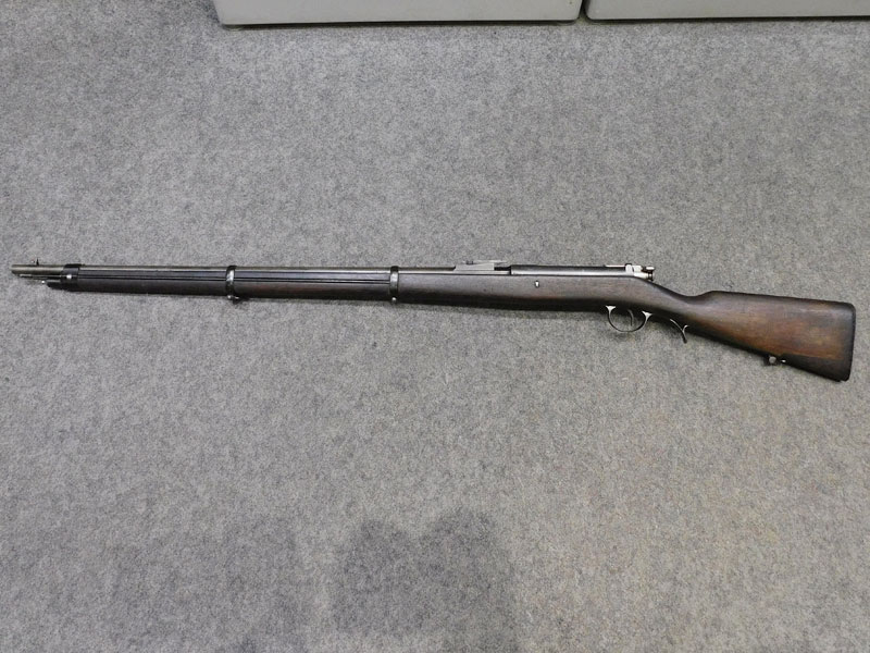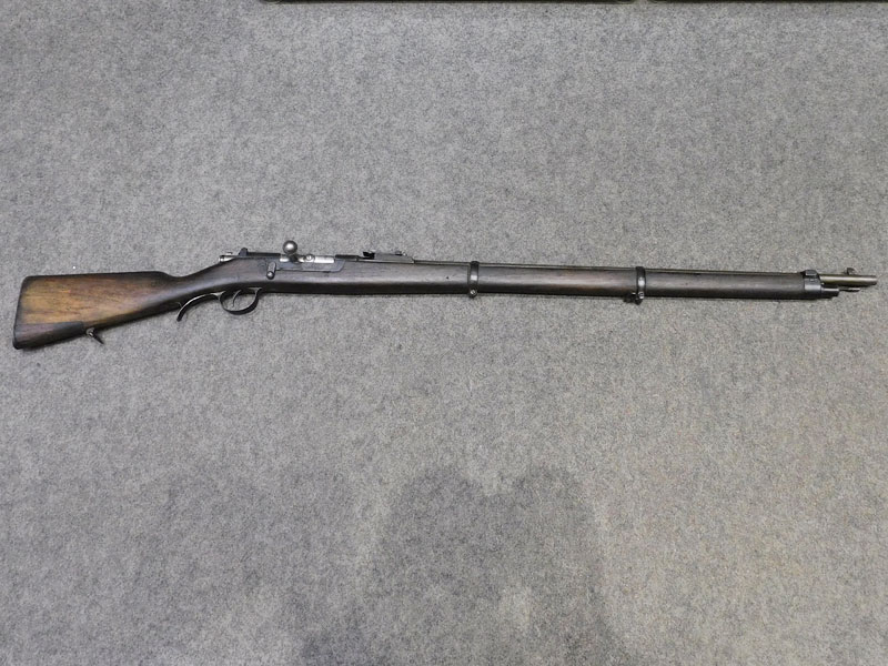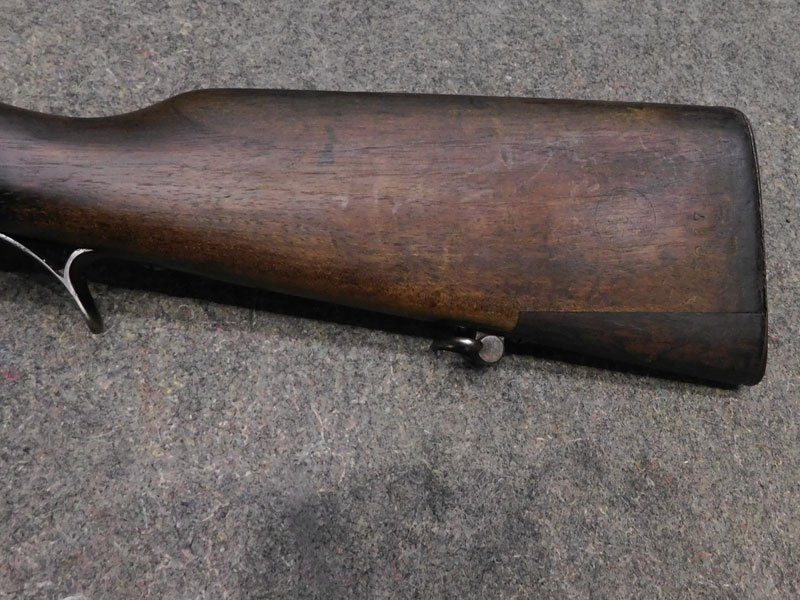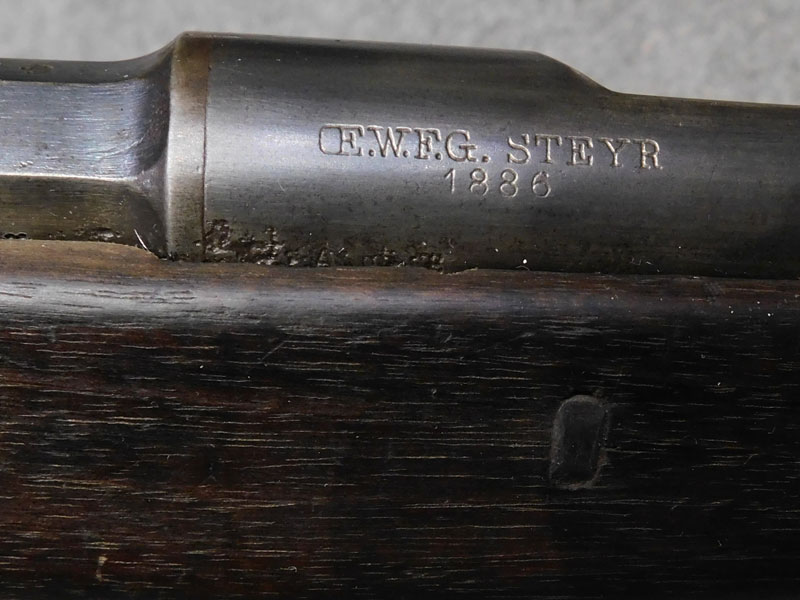fucile ex ordinanza portoghese OE.W.F.G. Steyr (Osterreischische Waffenfabriks Gesellschaft Steyr) modello 1886 Kropatschek – serbatoio 8 colpi calibro 8x60R –canna 820 mm. – canna, culatta e calcio monomatricola, otturatore no – anno 1886 – punzone Luigi I° – calciatura riparata in arsenale con cartiglio Luigi I° leggibile e cartiglio OEGW parzialmente leggibile – cut off – prima serie senza astina copricanna – solo 49 mila pezzi prodotti – condizioni generali molto buone – canna ancora ben spigolata -classificata arma antica