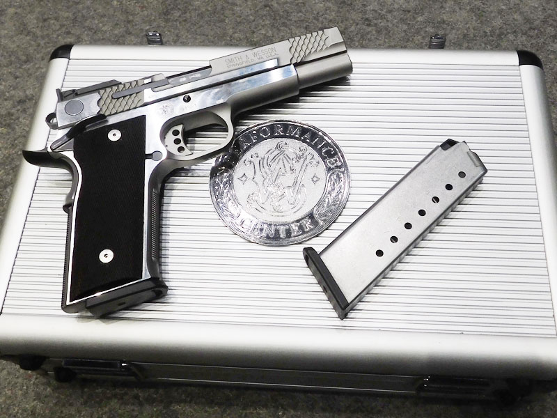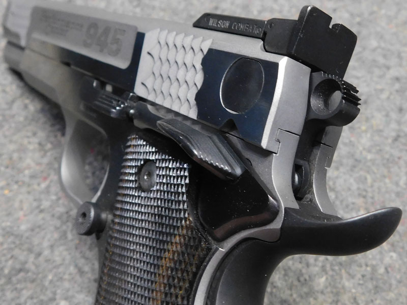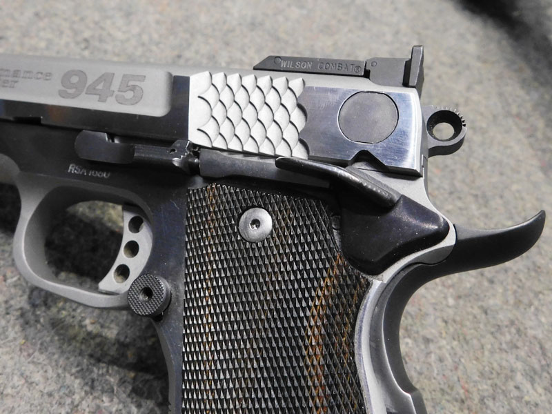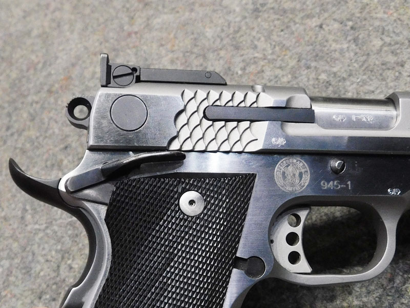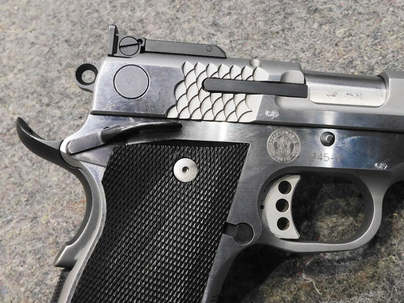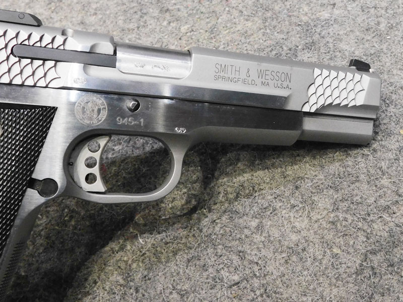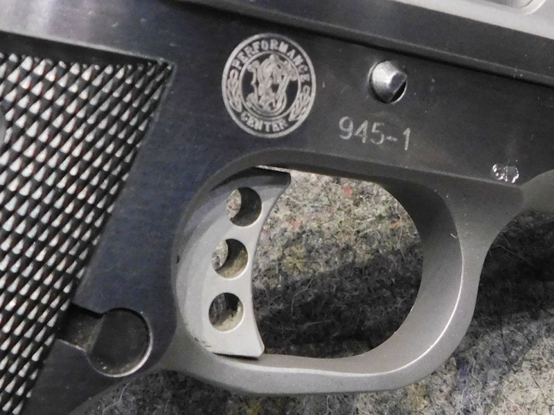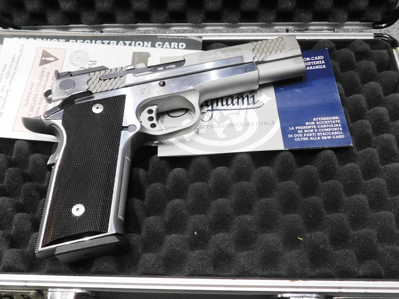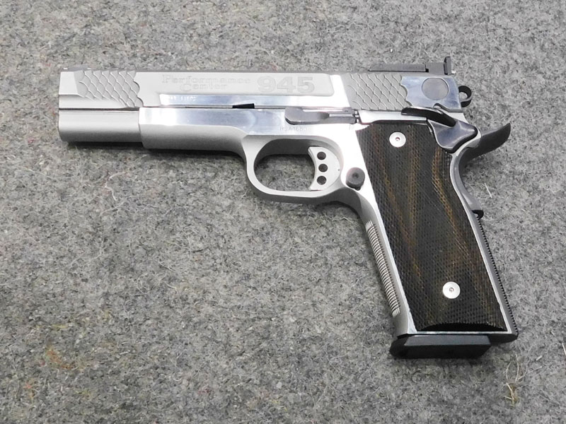 Pistola sportiva usata Smith & Wesson modello 945-1 Performance Center – caricatore monofilare 8 colpi calibro 45 acp – canna selezionata match grade da 5 pollici (127 mm.) – carrello inox con intagli di presa a squama di pesce anche nella parte anteriore – boccola di centraggio canna Briley con finitura in nitruro di titanio – carrello in acciaio inossidabile con guide lappate a mano – tacca di mira regolabile Wilson Combat – sicura ambidestra – pulsante sgancio caricatore maggiorato – cane e grilletto match – guancette in legno originali S&W –versione barra 1 con finestra di visualizzazione del colpo camerato e sicura automatica al percussore – valigetta in alluminio con medaglione Performance Center e chiusure di sicurezza a combinazione – caricatore di scorta – classificata arma sportiva ottime condizioni generali
