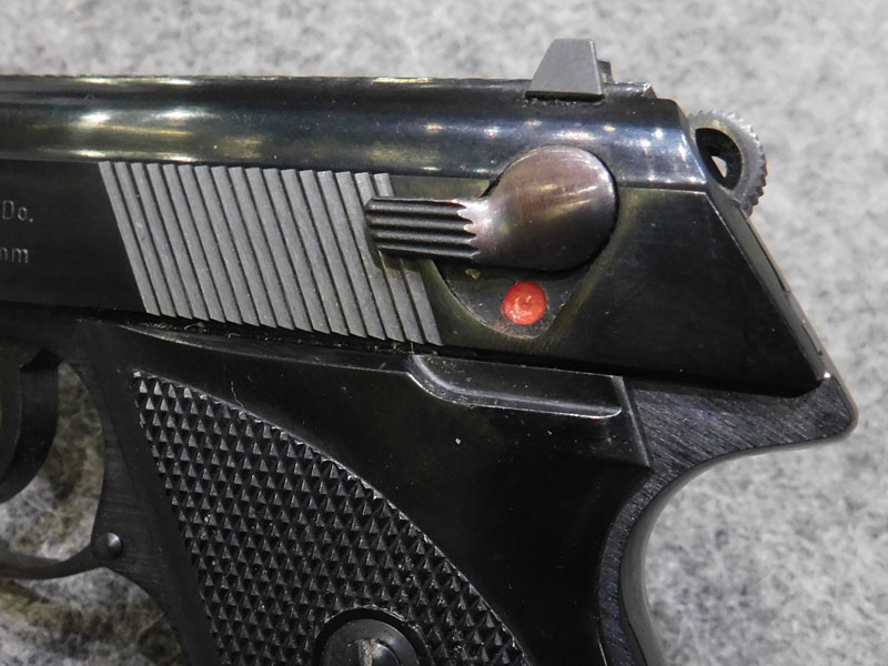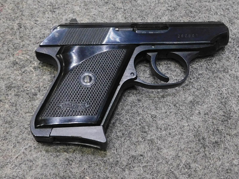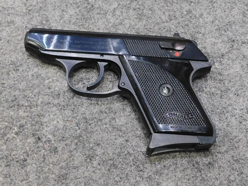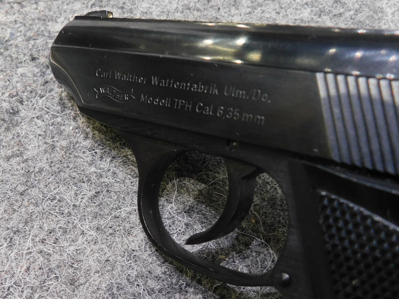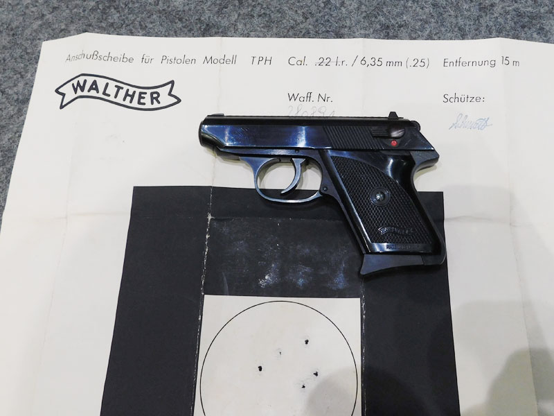 Pistola tascabile usata Walther modello TPH (Taschen Pistole Hahn) – caricatore sei colpi calibro 6.35 (25 auto) con pad poggiadito – canna 71 mm. – fusto in lega leggera – doppia azione con abbattimento el cane – guancette in plastica – scatola originale (danneggiata) e prova di tiro – classificata arma comune – condizioni generali ottime/eccellenti – ideale per porto occulto